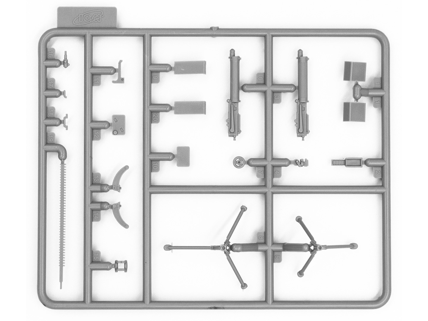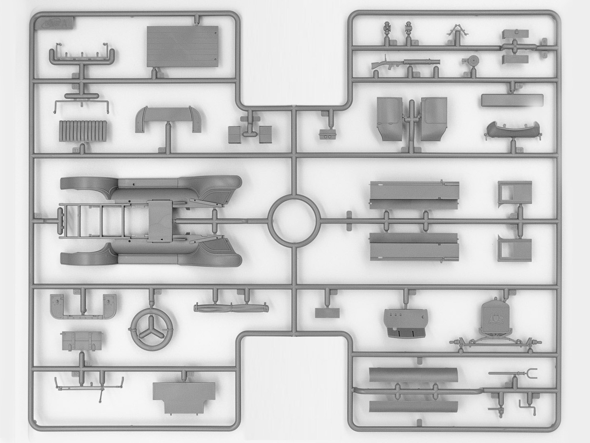 В набор входят 96 деталей для сборки модельного комплекта автомобиля Model T 1917 LCP и 44 детали для сборки модельного набора Vickers MG.