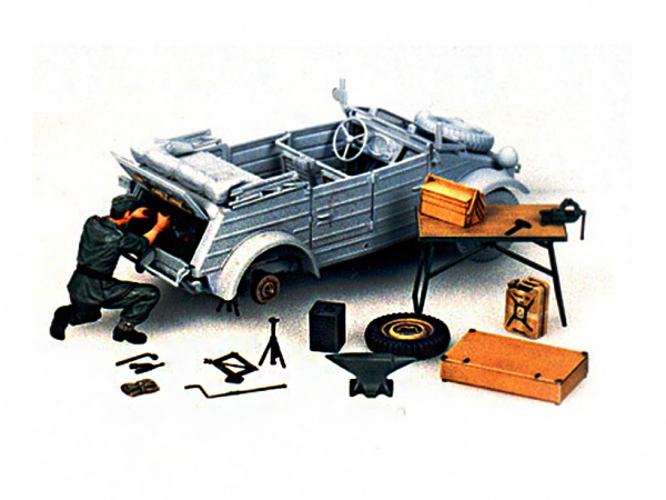 Сборная модель из пластика. Немецкий ремонтник, ремонтирующий двигатель KUBELWAGEN и различные принадлежности для ремонта.