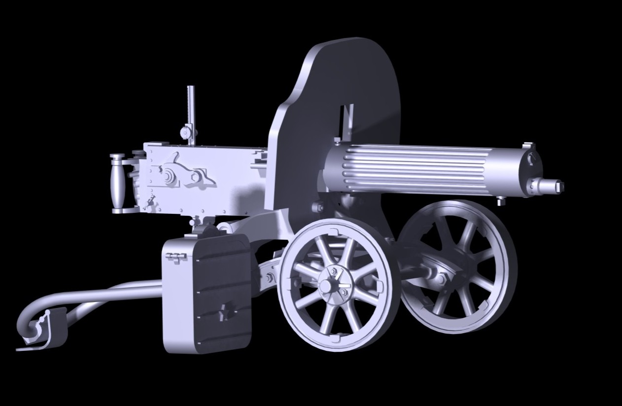 Детализированный сборный колёсный станок, проработанная казённая часть, кожух ствола с продольным рифлением, прицел, короб с лентой патронов.