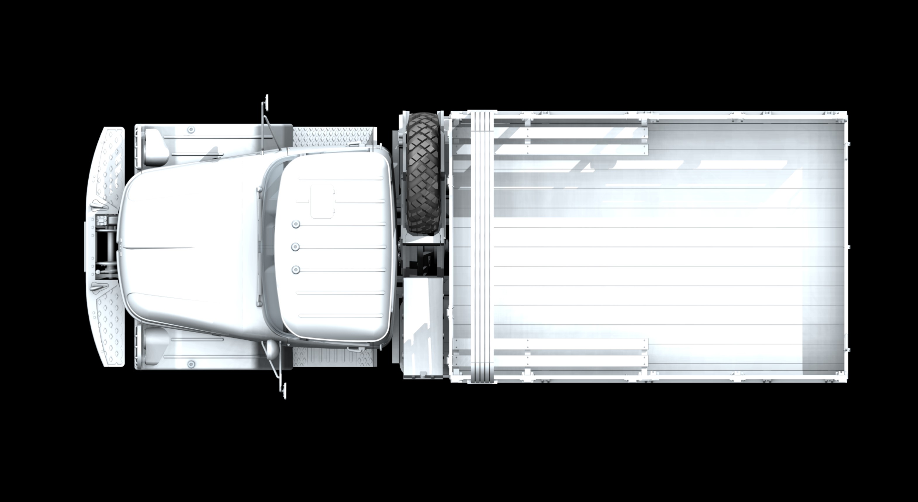 Проработанная решётка радиатора, запасное колесо за кабиной, топливные баки, зеркала заднего вида, дворники, решётки защиты фар и множество других подробностей.
