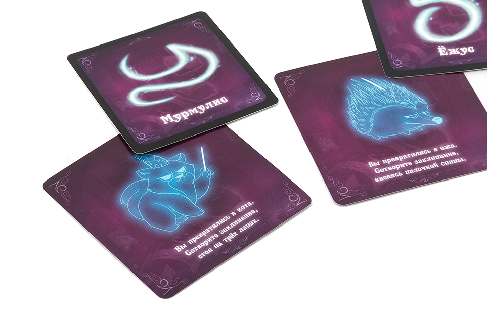 В каждом наборе есть большие и маленькие карточки с одинаковыми заклинаниями. Маленькие карточки - это задания для волшебника. Большие карточки раскладываются на столе для остальных участников. На одной стороне большой карточки - название заклинания и его символ, по которому и будет угадываться заклинание. На другой - описано действие заклинание.