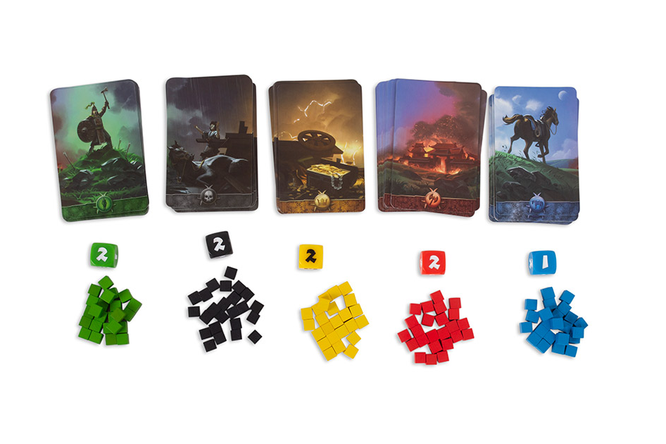 Кубики добычи бывают пяти цветов. Они нужны, чтобы заполнять телеги. Чем больше заполненных телег, тем больше победных очков игрок получит в конце игры, причем очки начисляются и за все телеги и за их комбинации.