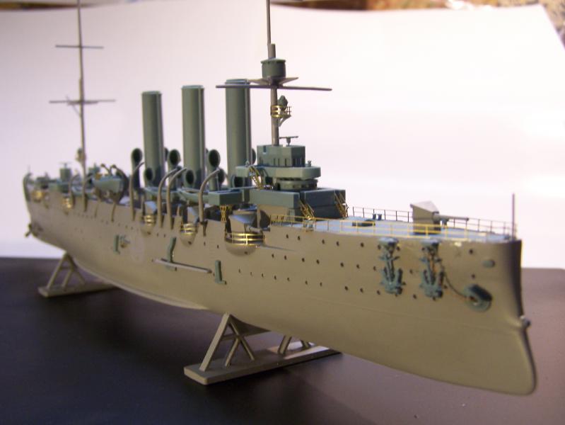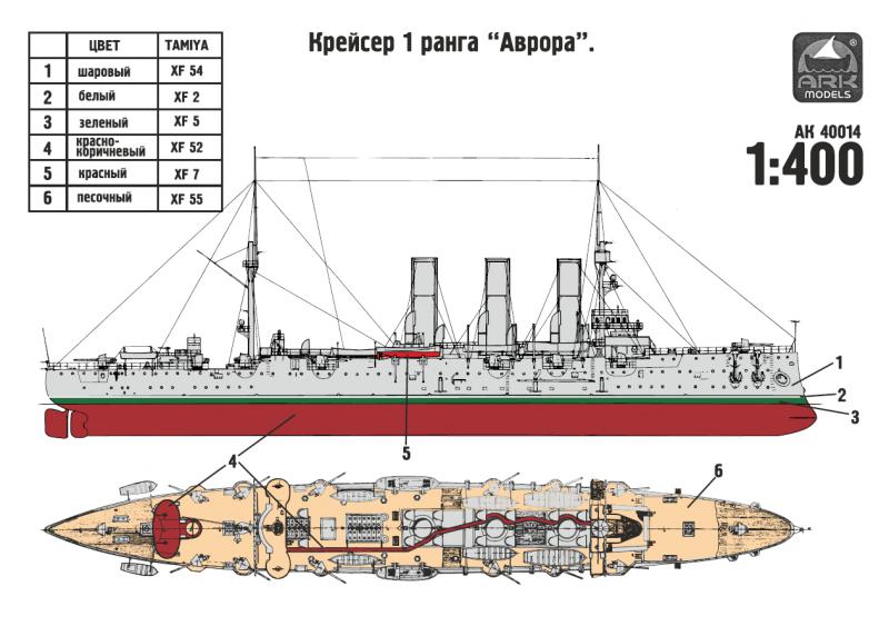 Крейсер «Аврора» строился 7 лет с 1896 по 1903 год. Участник Русско-японской войны, крейсер был одним из немногих кораблей, кому посчастливилось уцелеть в Цусимском сражении. В период Первой мировой войны крейсер «Аврора» принимает активное участие в боевых действиях на Балтийском море в составе 2-й бригады крейсеров. В ночь на 25 октября (7 ноября) 1917 года выстрелом из носового орудия «Авроры» был дан сигнал к началу штурма Зимнего дворца, то есть к началу Октябрьской революции. С началом Великой Отечественной войны крейсер «Аврора» и его экипаж встали на защиту города Ленинграда. Весь период ленинградской блокады 1941-1944 годов «Аврора» стояла в порту Ораниенбаума (город Ломоносов) и, подвергаясь систематическим обстрелам и бомбардировкам, вела огонь по фашистам. В 1948 году крейсер «Аврора» был пришвартован у Петроградской набережной Ленинграда в качестве учебной базы Ленинградского нахимовского училища. В 1956 году на «Авроре» был открыт музей. В июле 1992 года на крейсере был вновь поднят Андреевский военно-морской флаг - символ морской мощи России. За время своей более чем столетней службы крейсер многократно модернизировался.С 1941 г. по 1987г. корабль имел вид, который воспроизводит модель компании АРК №40001. Однако ремонтные работы в 1984-87 гг на заводе им. Жданова в Ленинграде (к 70-летию Великой Октябрьской революции) и недавний ремонт в судоремонтном заводе Кронштадта вернули крейсеру вид, который он получил после капитального ремонта и модернизации во время Первой мировой войны в 1916-17 гг. Именно в таком виде корабль стал легендарным участником революции и именно такой вид имеет сейчас на своей нынешней стоянке в Санкт-Петербурге. Именно этот вид легендарного корабля и воспроизводит данная модель с помощью дополнительных смоляных деталей".